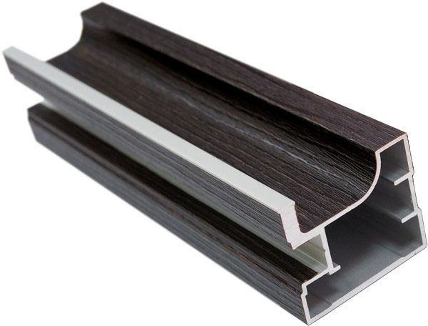 Предусмотрен новый вариант окутки с использованием молдинга из анодированного алюминия на тонкой продольной грани профиля. Аналогов подобного вида окутки алюминиевого профиля в пленку ПВХ НЕТ!