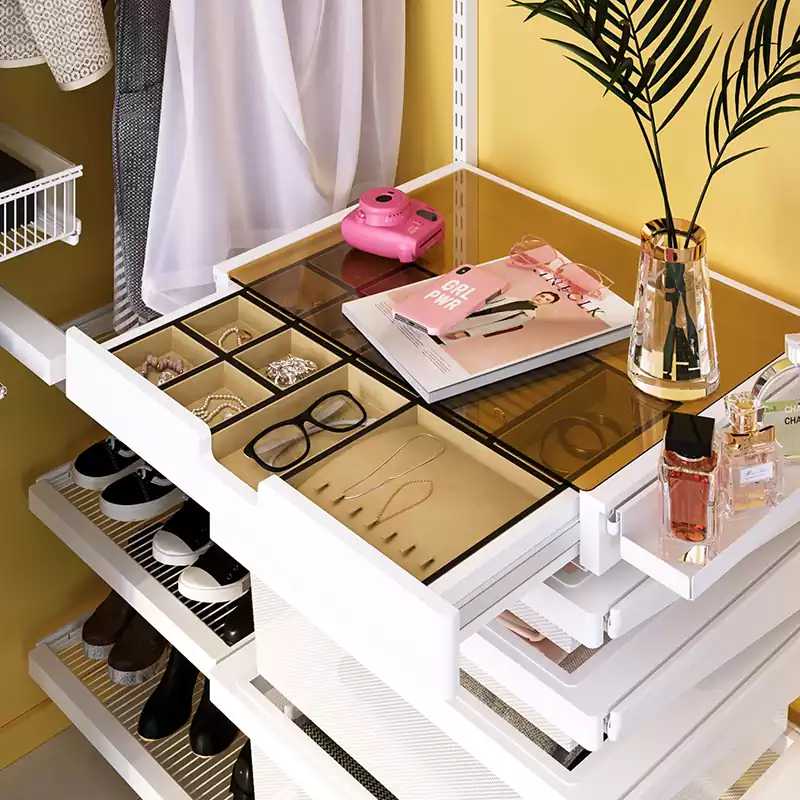 Добейтесь безупречного сочетания всех деталей в вашей гардеробной. Декоративные элементы в новом оттенке идеально дополняют классическую металлическую систему, мягко подчеркивая её линии. Однотонная комбинация разных фактур — металл и дерево — модный союз материалов для современных стильных интерьеров. Матовое покрытие дерева оттеняет блеск металла, добавляя теплоту и законченность вашей гардеробной..